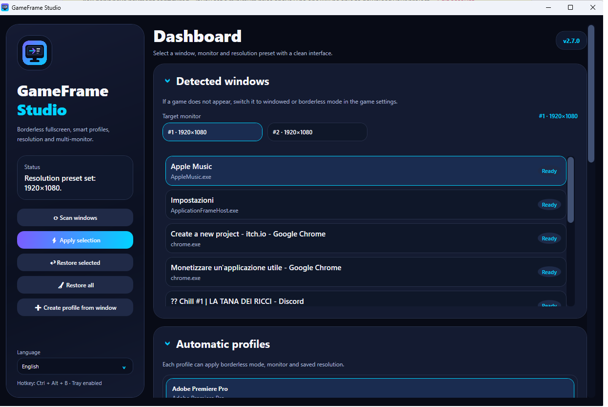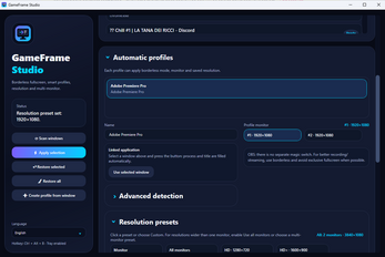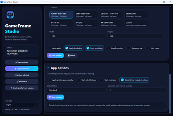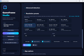 Create profiles for your games and let GameFrame automatically apply your preferred borderless mode, custom resolution and monitor layout every time the game window is detected.