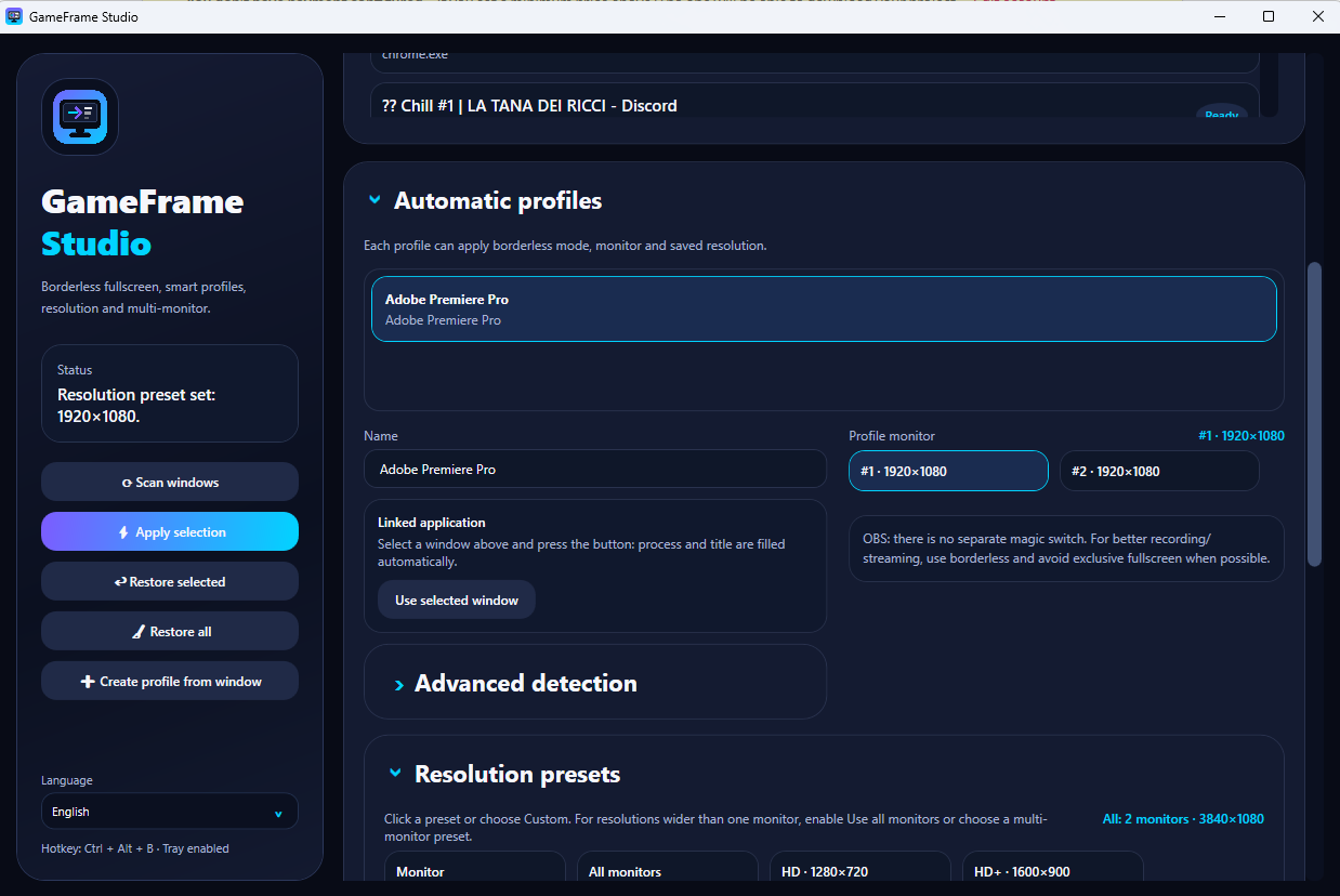 GameFrame Studio solves this by saving everything inside a profile. Once your profile is configured, GameFrame can automatically detect the game and apply the right setup for you.